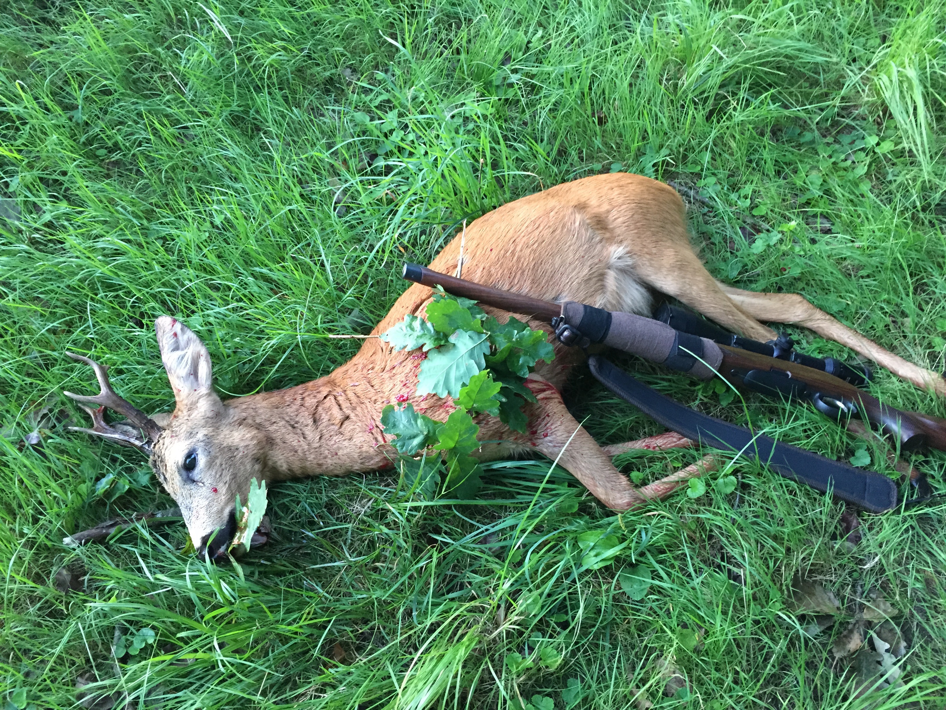 Wir schnauften kurz durch und gaben dem Bock noch ein paar Minuten, bevor wir zum Anschuss gingen. Schweiß konnten wir genügend finden, dann folgte ich der Fährte und gleich hinter der Wiesenkante etwa zwei Meter im Wald lag der Bock. Die Freude war groß, ich traf ihn etwas hinterm Blatt, die 308 Win. Geco Teilmantel durchbohrte die Lunge und ließ den Bock noch etwa 30 Meter flüchten, bevor er verendete. Es ist ein passender Sechser Abschussbock, mit dunklen Stangen.