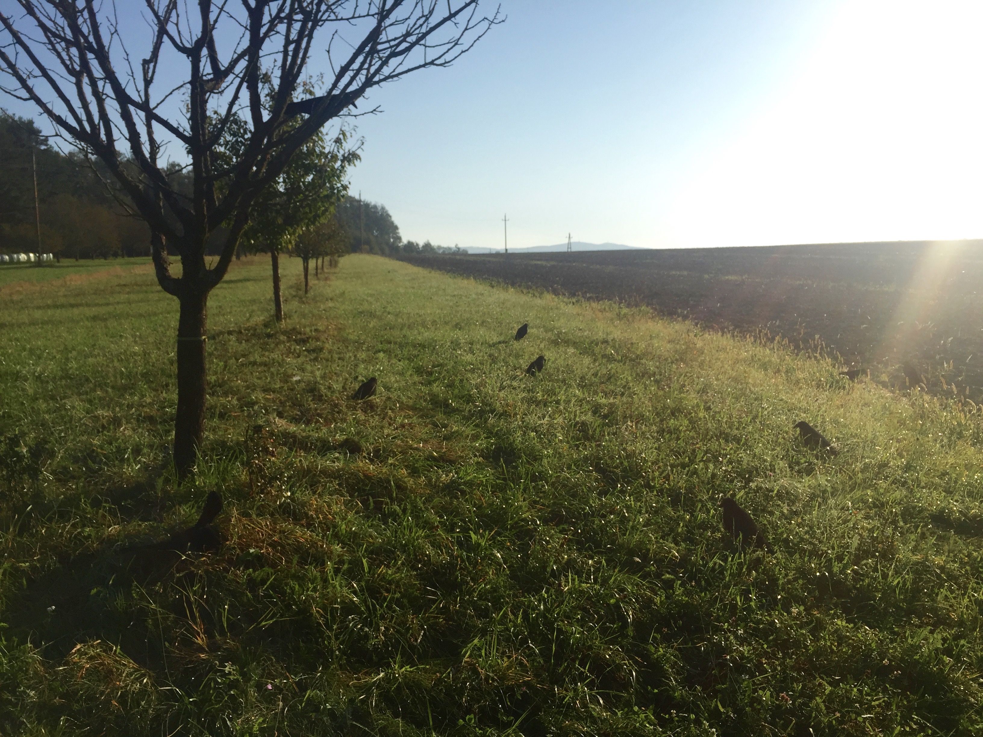 Nach der Rehbrunft geht es im Revier wieder ruhiger zu. Um etwas fürs Niederwild zu tun, ging es vor Kurzem auf Krähenjagd. Lockkrähen, Tarnnetz und Flinte eingepackt, ging es noch im Dunkeln ins Revier. Das Lockbild baute ich auf einer Wiese neben einem abgeernteten Acker auf. Hinter meinem Schirm steht eine Hütte und ein Hochsitz, auf dem ich auch eine Wächterkrähe postierte, die anderen schwarzen Attrappen stellte ich rund um einen Baum auf. Die beflockten Lockkrähen habe ich bei alp-jagd.at bestellt und sie sind sehr robust und ziehen auch die Aufmerksamkeit der Krähen auf sich.